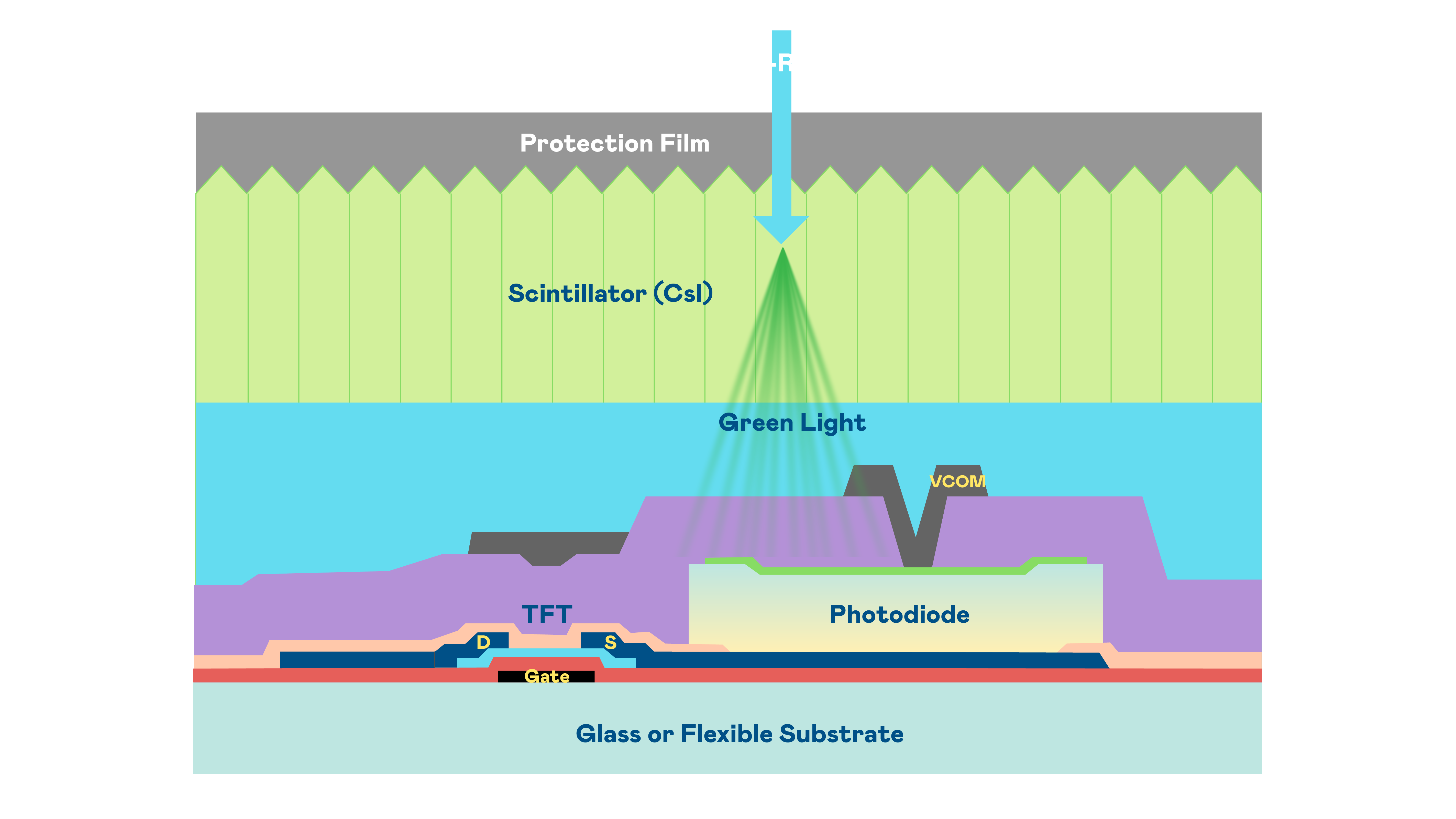 U8国际的X光影像感测阵列使用薄膜电晶体 (TFT) 作为每个像素的读取开关,搭配光电二极体(Photodiode)的光电转换元件,用以感测X光影像讯号。